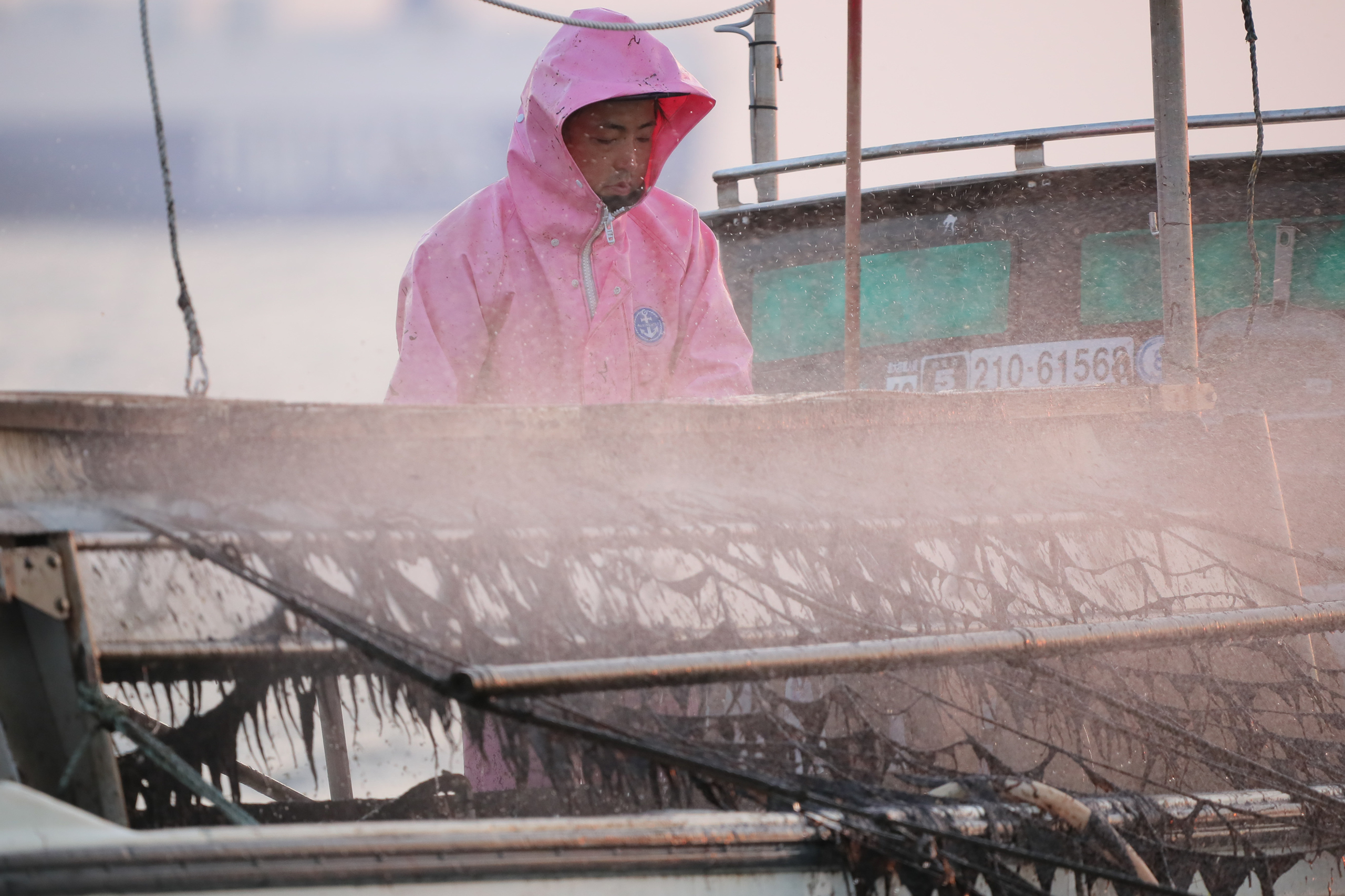 海苔が伸びてくると同時に網に余計な珪藻類がついたり、病気にかかりやすくなったりします。海苔の品質の低下するのを防ぐため、網を洗う作業を行います。通常、海苔は酸に強く珪藻類は酸に弱いという性質を利用してりんご酸などの有機弱酸を利用して行う、これを酸処理といいます。不純物は取り除かれるのできれいな海苔はできるのです。